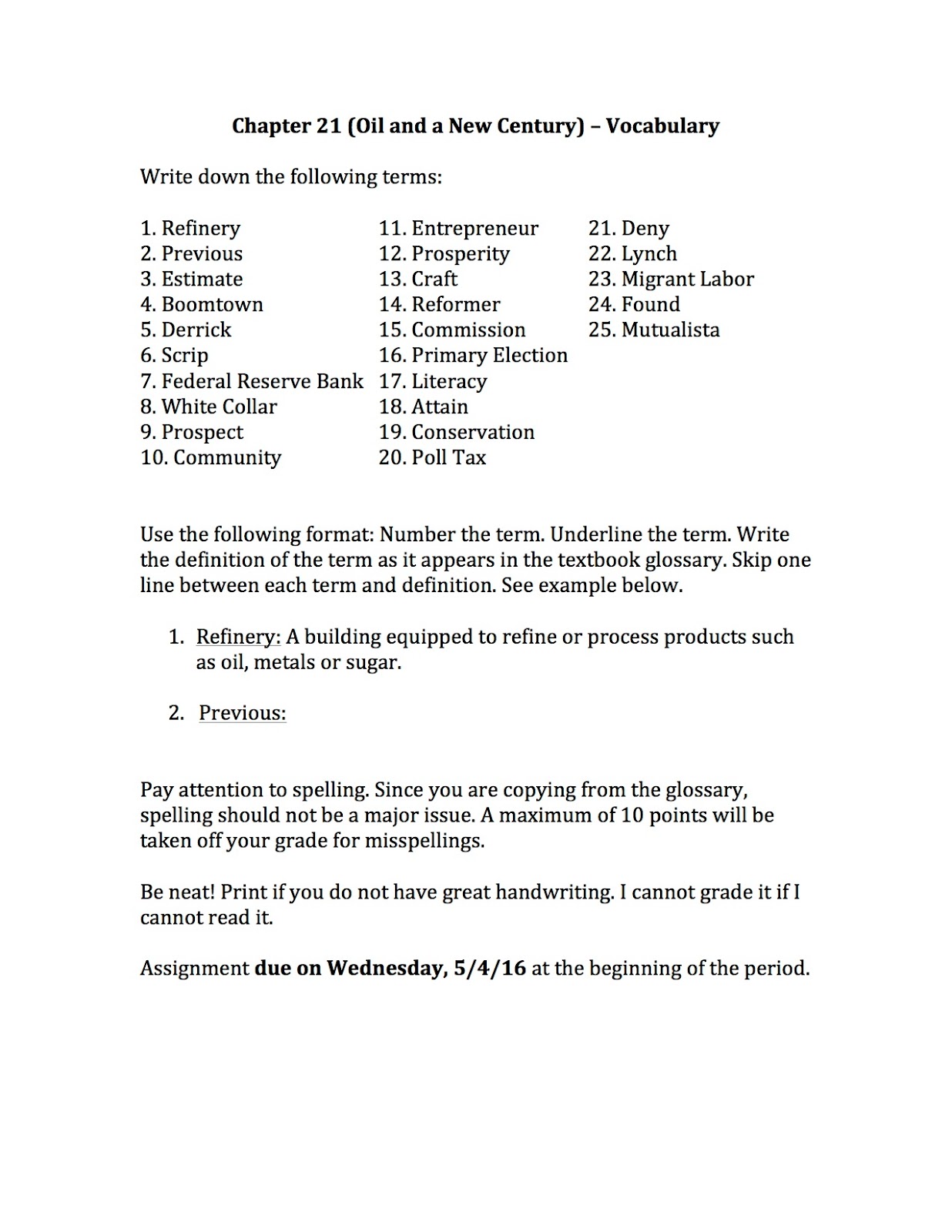 The vocabulary assignment over Chapter 21 (Oil and a New Century) was assigned today. This assignment is due at the beginning of the period on Wednesday. I have attached the assignment below.